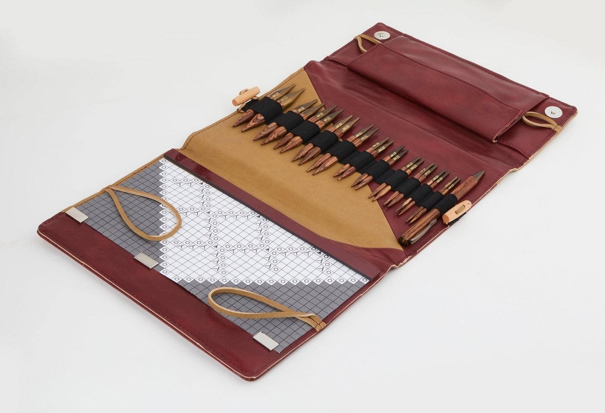 Set of 11 sizes of Ginger Interchangeable Circular Needles packed in a premium needle case with chart keeper in burgundy & beige finish.